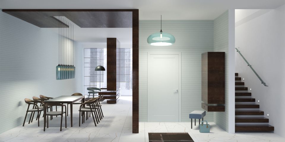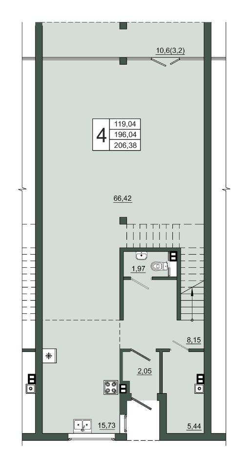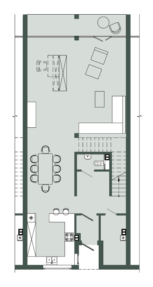 - на первом уровне — объединённая зона кухни, гостиной и столовой с выходом на собственную террасу и участок,